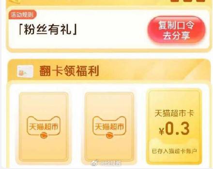 天猫超市-首页右下方悬浮图标“惊喜口令”-输入口令“粉丝有礼”进入翻牌可领随机猫超卡