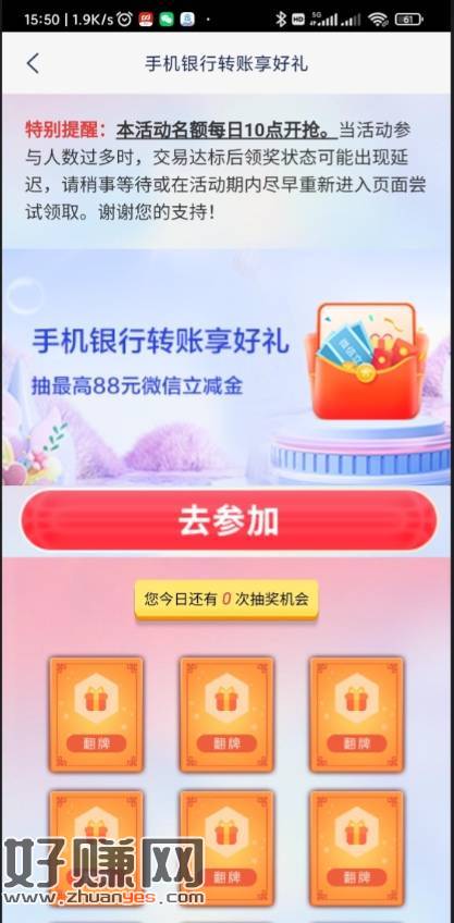 活动期间,我行借记卡客户使用我行手机银行(浦发银行APP)进行转账汇款,且单笔金额达到20万元(含)以上,即可抽取最高88元微信立减金一份。同一用户活动期内限参与1次,每日活动名额限量1000份,10点开抢,先到先得,领完即止。