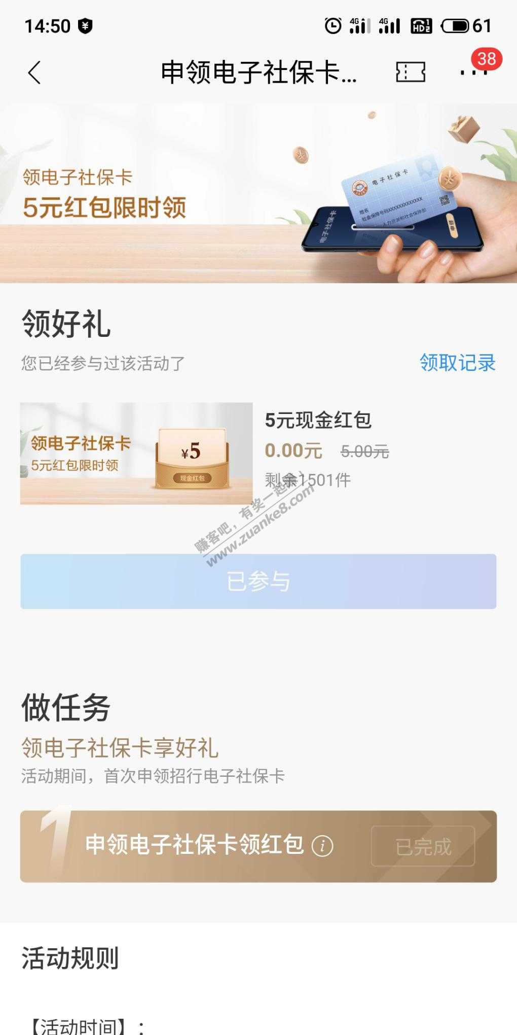 招商银行,办理电子社保卡,一个五元红包和一个抽奖