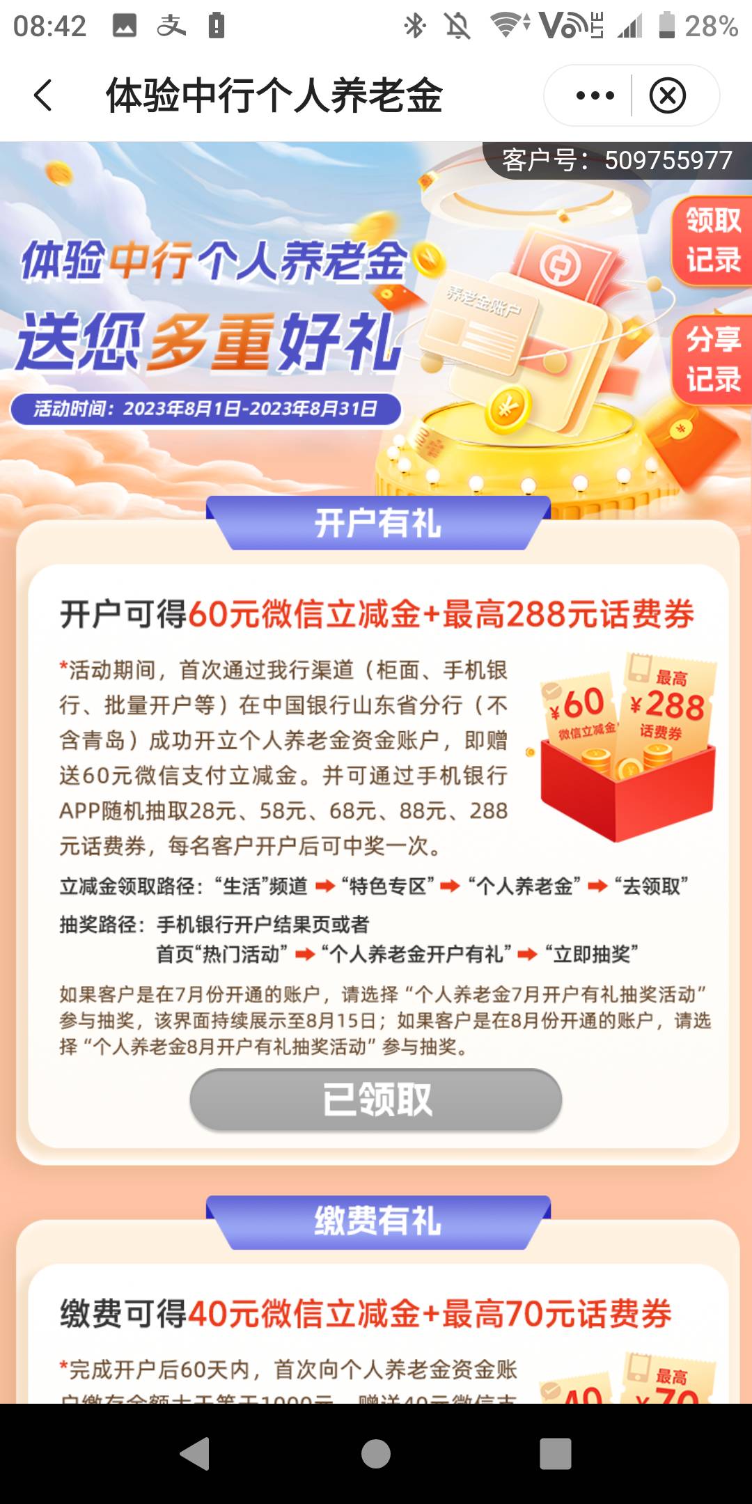 中行济南养老到了 这周四开今天早上到领的,开通领取入口在生活-特色专区-个人养老金领取,开通的时候会显示去开户,之后能领取就变成去领取了。自行看图