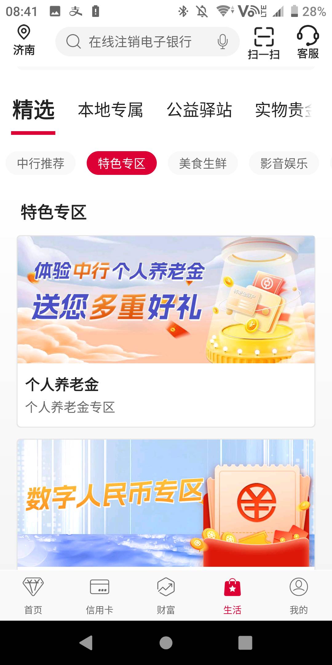 中行济南养老到了 这周四开今天早上到领的,开通领取入口在生活-特色专区