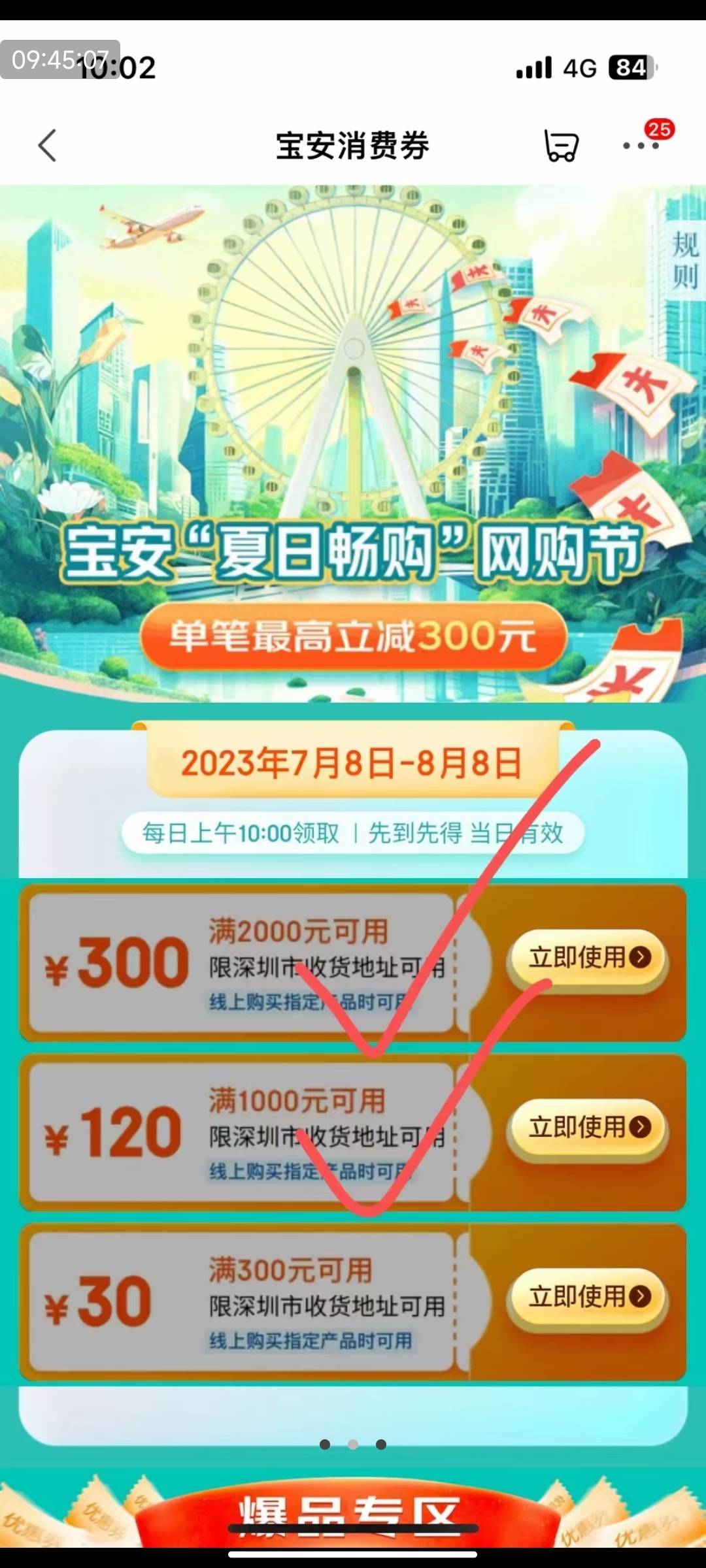 在深圳的,早上10点京东app搜“宝安消费券”,领300券。不要提前进去,页面不会自动刷新,首页等59分59秒点进去领取!