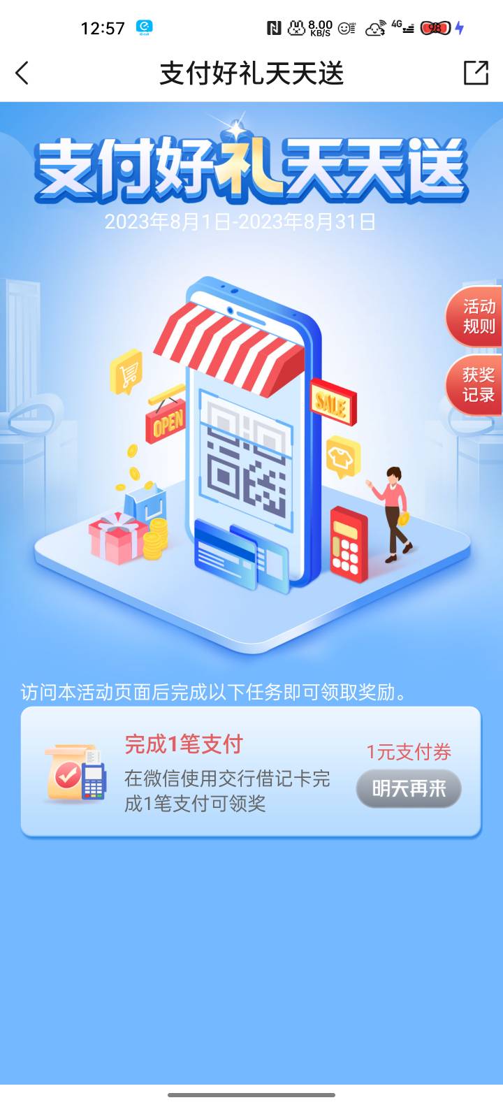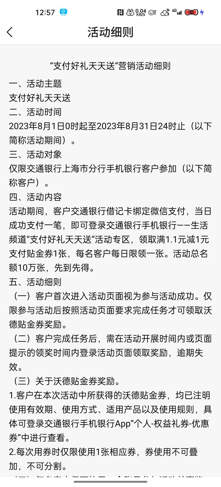 有上海交行借记卡的,每天支付一笔可以领一张1贴金券,注:可以直接用零钱通充值完成支付!T的话不行!