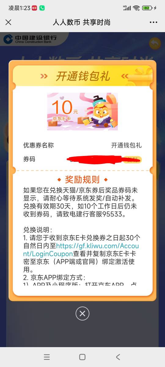 建行开通数字 可以领取10京东卡