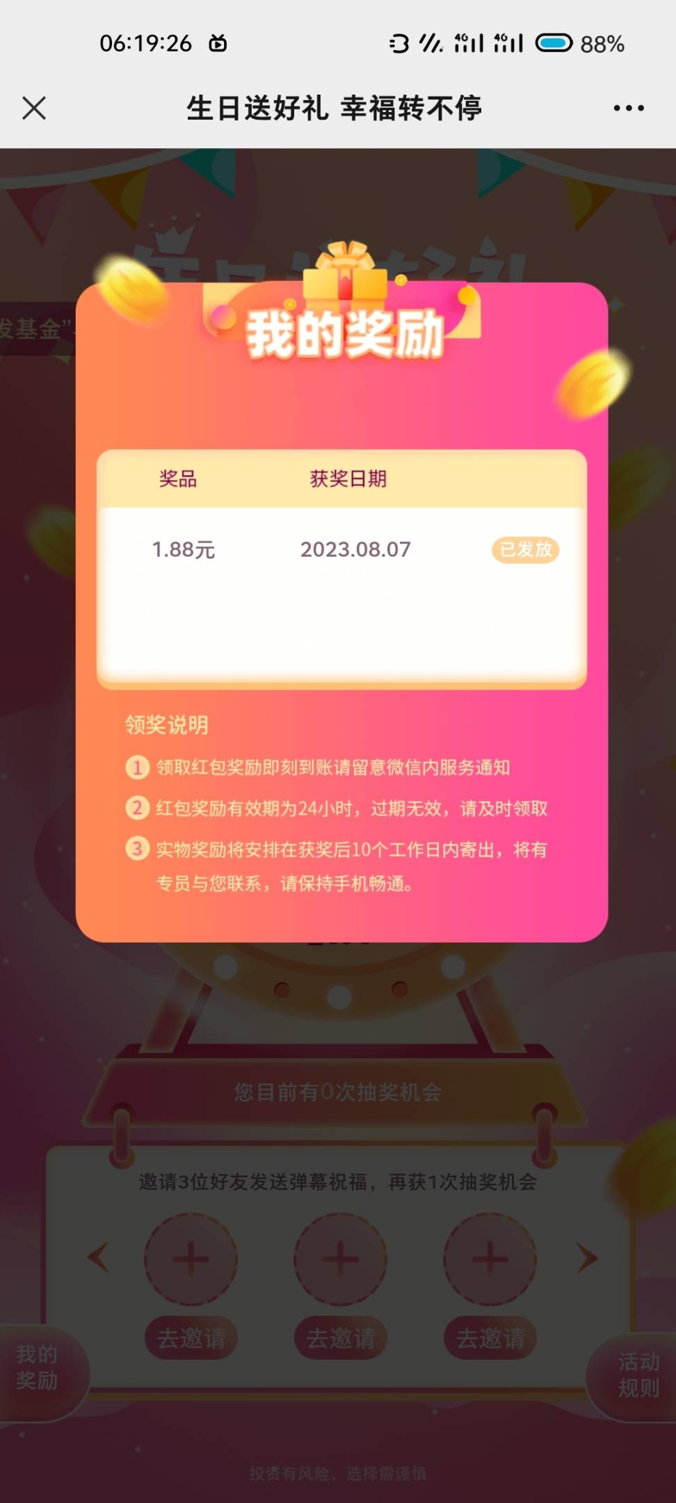 微信关注gzh广发基金回复生日抽奖,秒到1.88。早餐钱有了