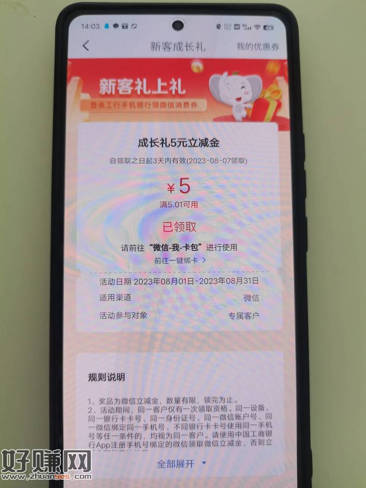 工行APP,生活,上滑 ,下面新客成长礼,5元大毛