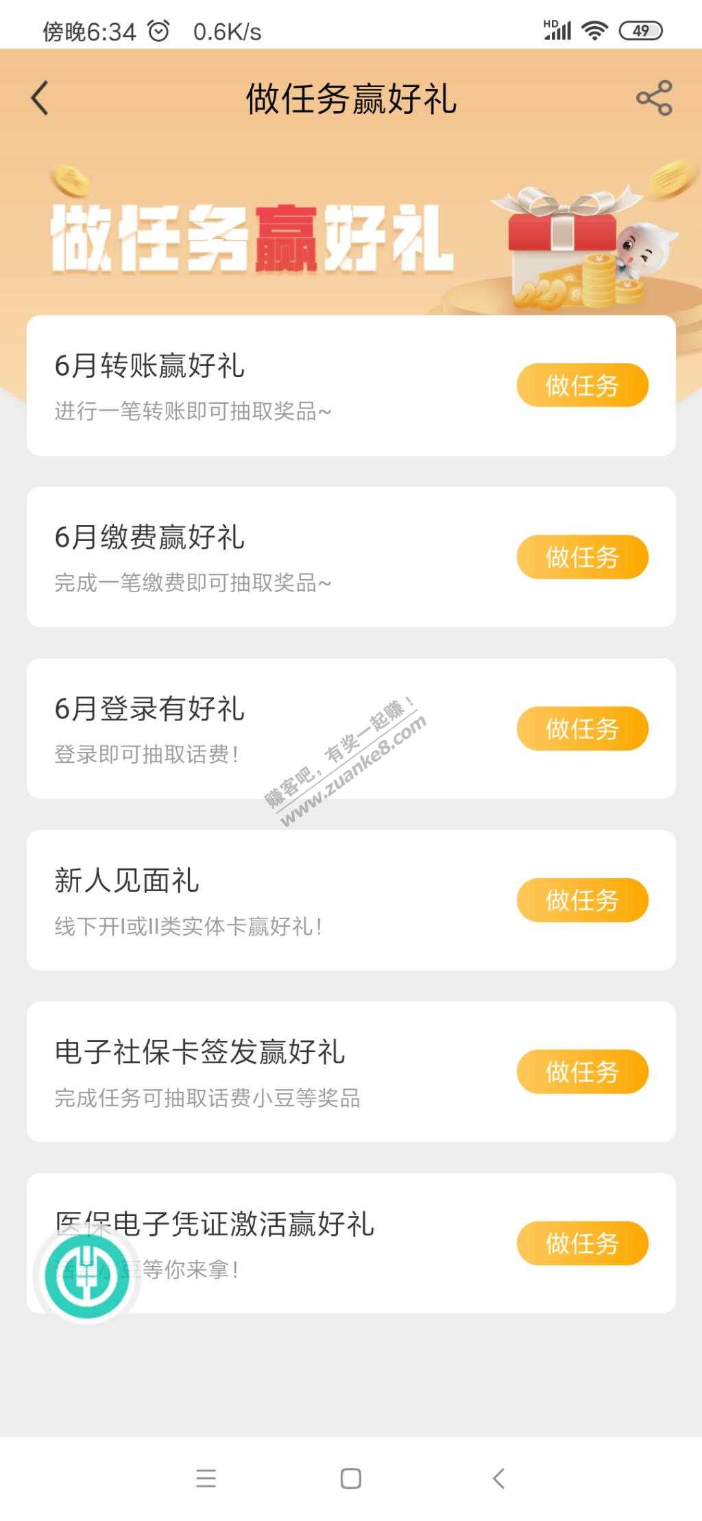 app-我的-点签到,找到做任务赢好礼,3个任务登录,缴费和转账,分别完成后抽奖,3中3(坐标山东,每个省应该任务和奖项不同,我们这1等奖5话费。)