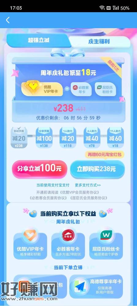 邀请33人,18元开一年优酷会员+必胜客年卡+屈臣氏粉丝卡