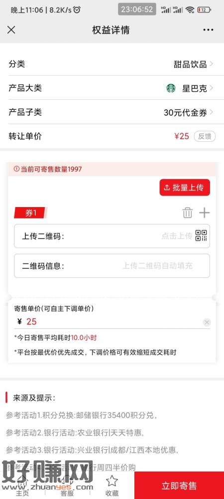 12点领 每天润5 建行生活搜星巴克随便进一家店 20元买30代金券 玖玖25回收 每天一张一共领4张润20 寄售链接