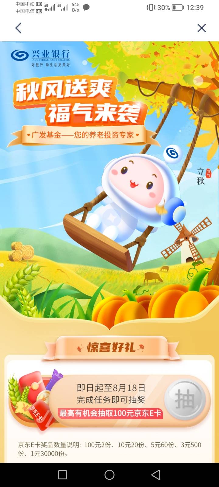 首发!兴业app打开弹窗秋风送爽完成两个任务抽e卡!