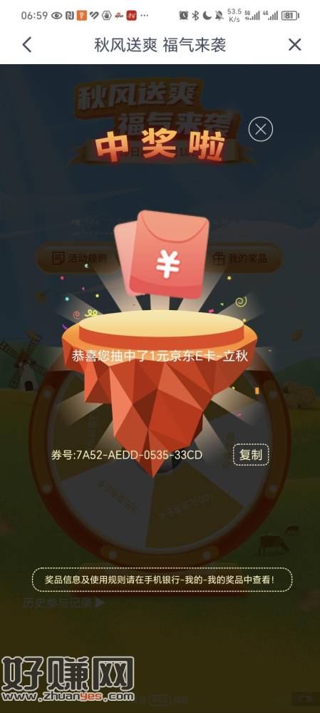 兴业APP,进去弹窗秋风送爽抽奖,中了1元京东卡
