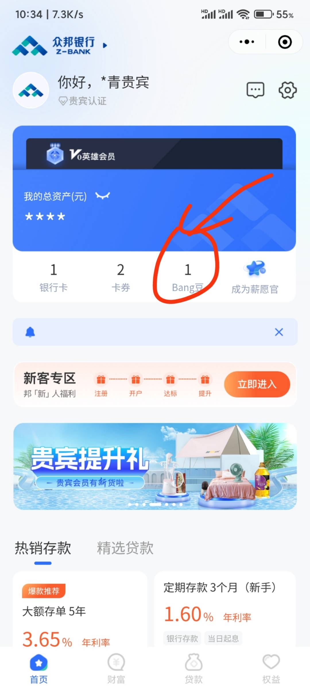 众邦银行小程序抽奖自己看图操作。有bang豆的去抽奖 50bang豆一