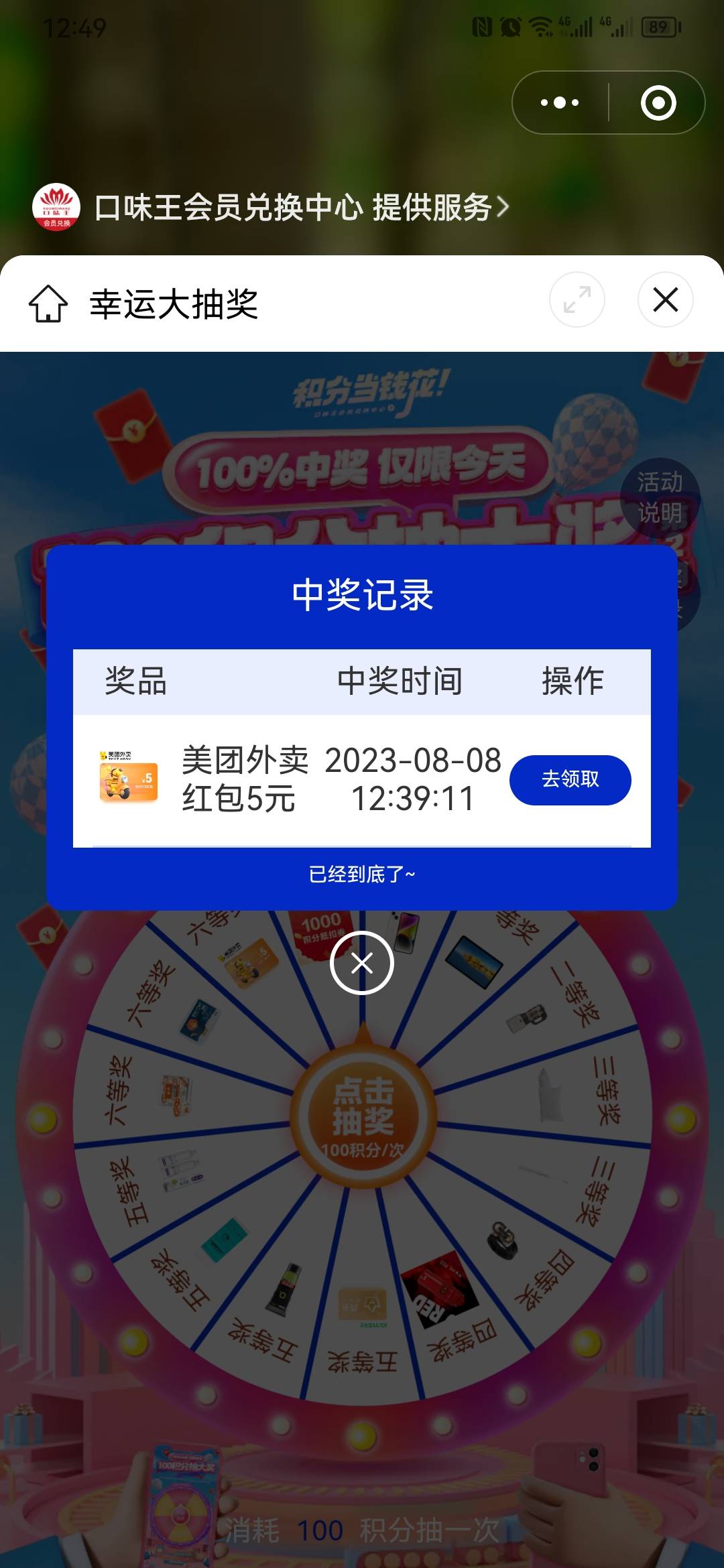 口味王会员中心,100积分抽奖,多号多申请,大概率5美团,我五中三,冲冲冲冲冲冲,割割们