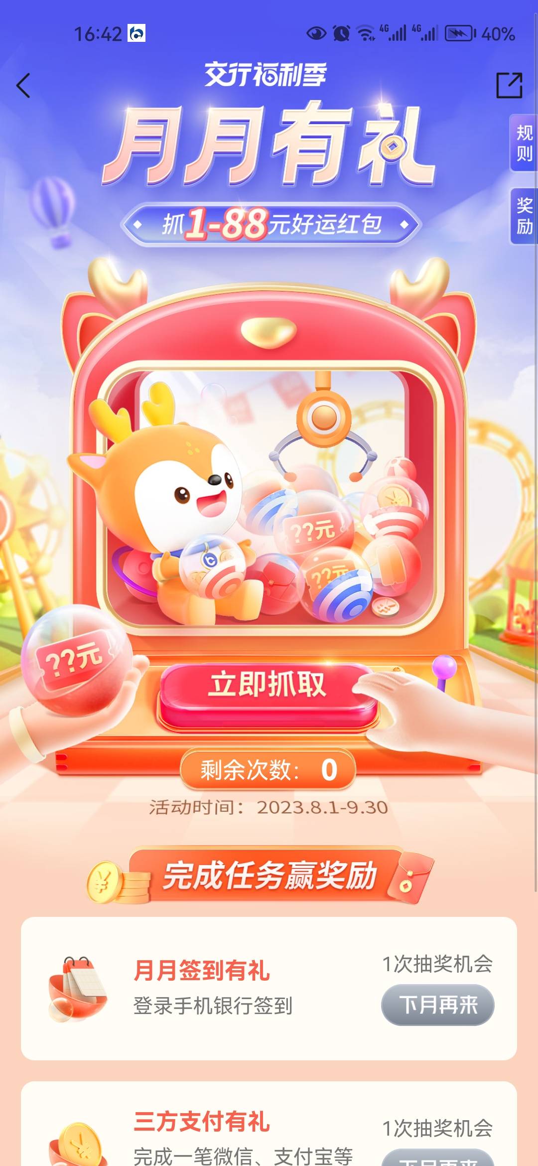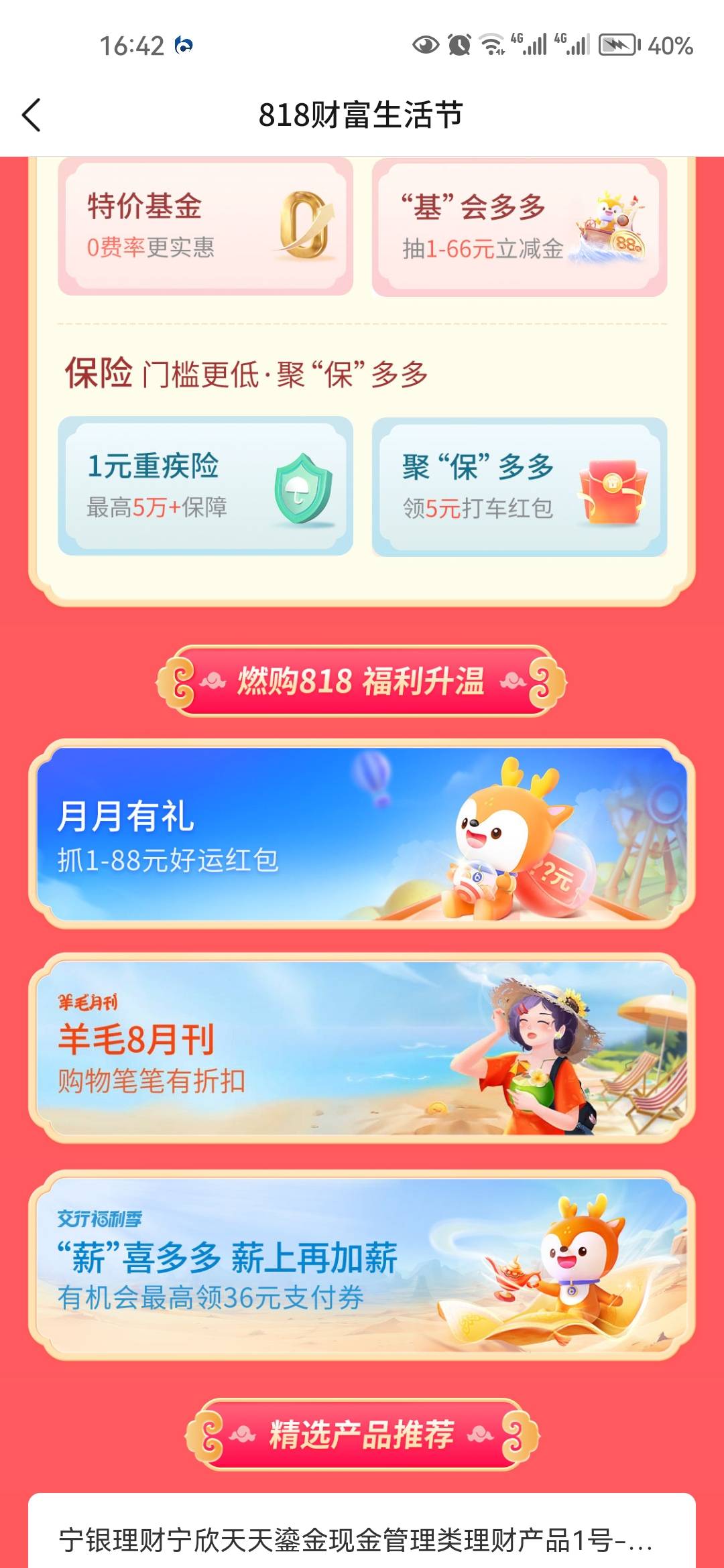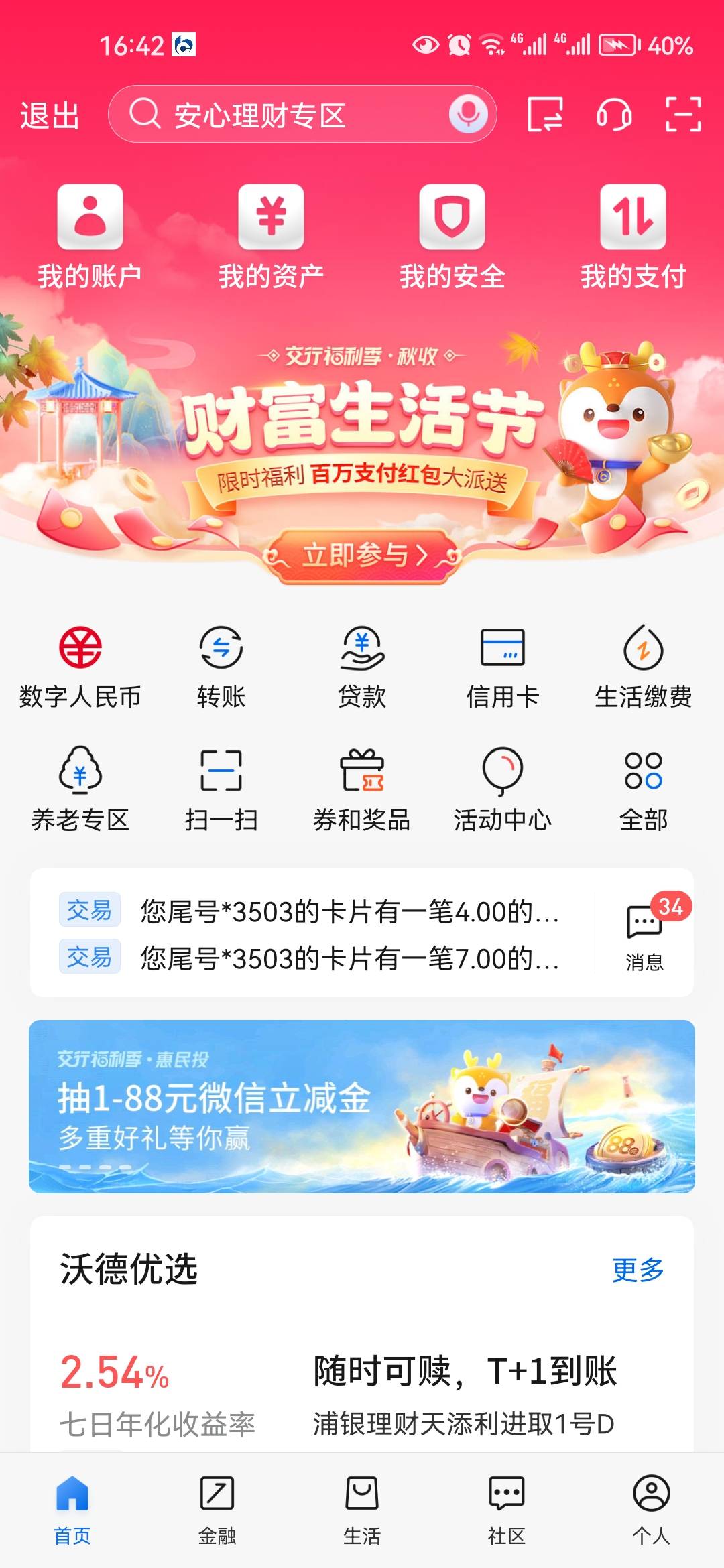交行首页横幅财富生活节,往下滑下面月月有礼抽低保