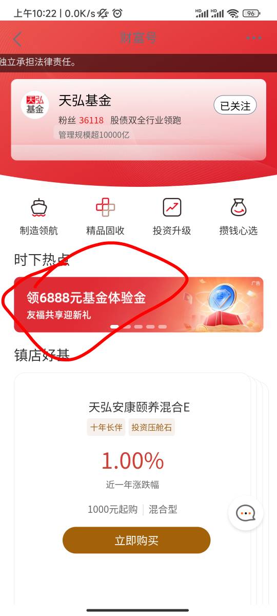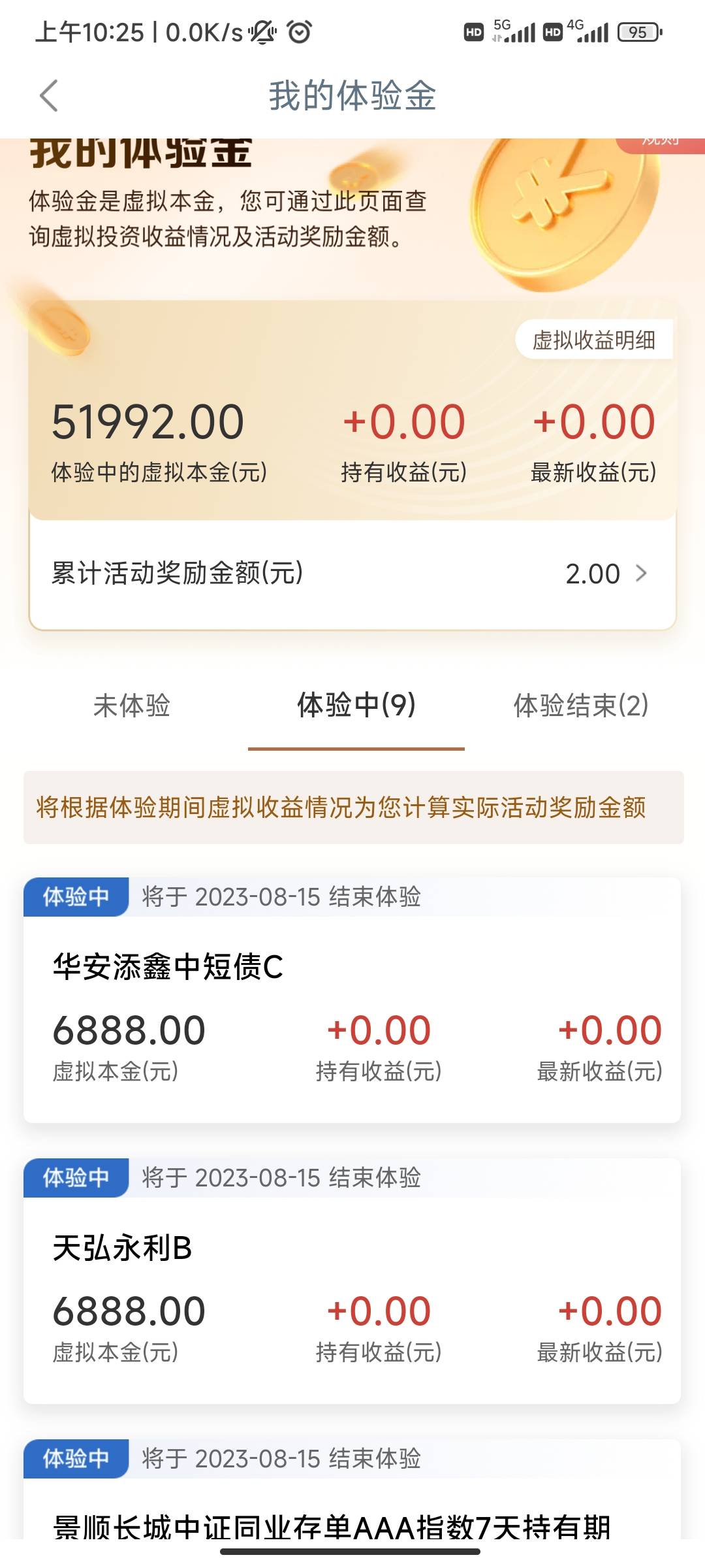 大妈任务中心有这活动的去搞下吧,关注送体验金附抽立减金,每个体验金0-1r的收益,嫌少的别去,积少成多,我估摸着9个怎么也得有个四五毛