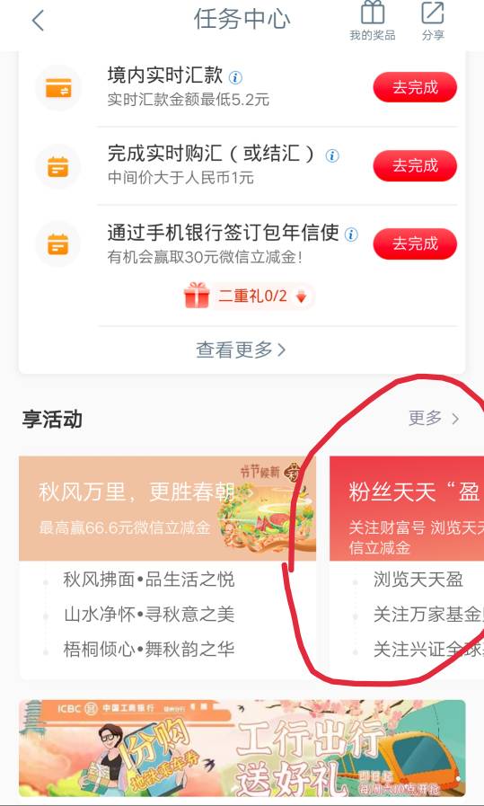 工行大妈。任务中心,自己去看,反正没毛,领的忽略,没领的关注一个。领一个体验基金,