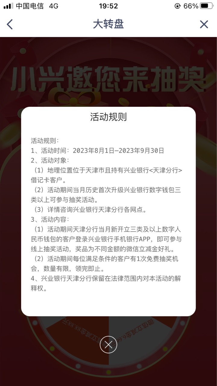 兴业定位天津,新开数币钱包升级三类抽奖,有天津二类就行,不知道是不是必中,我中了十毛,不限卡,注销重开不知道行不行,(看规则应该不行)不喜勿喷