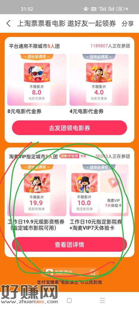 淘票票开团拉4个,40以下的只要19.9。出平台10+利润。