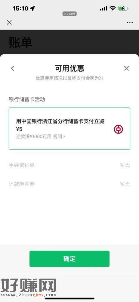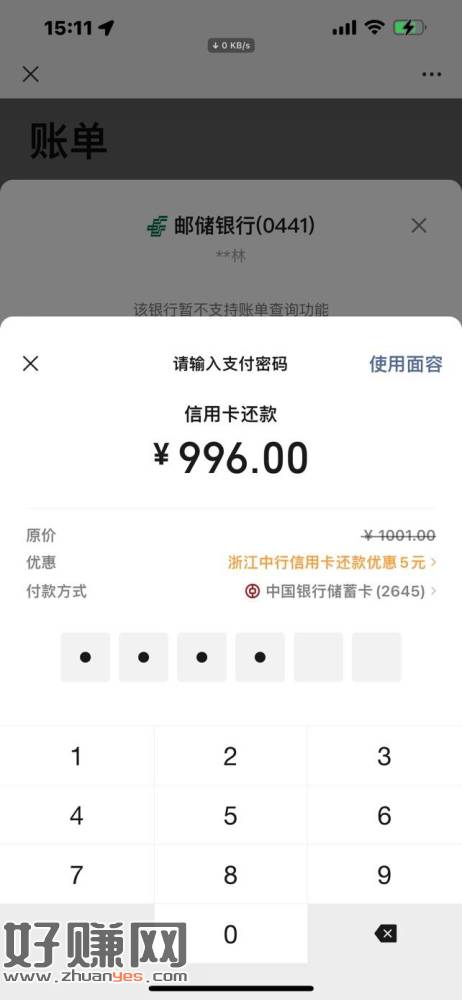 微信浙江中行借记卡还任意信用卡,1000-5,加上手续费,少