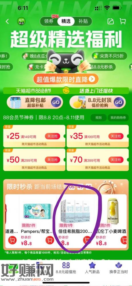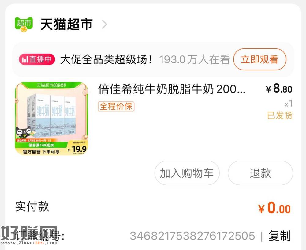 8.8猫卡包邮6只脱脂牛奶(可以使用乳饮冲调金),今天还有