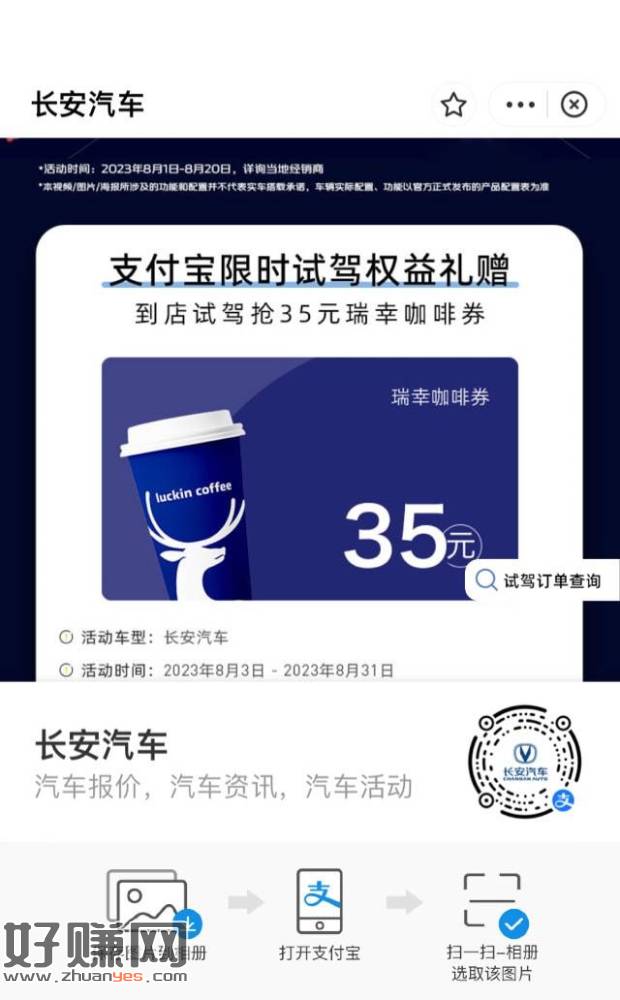支付宝上长安试驾送瑞幸,需要试驾协议可以百度p图上传,也可以
