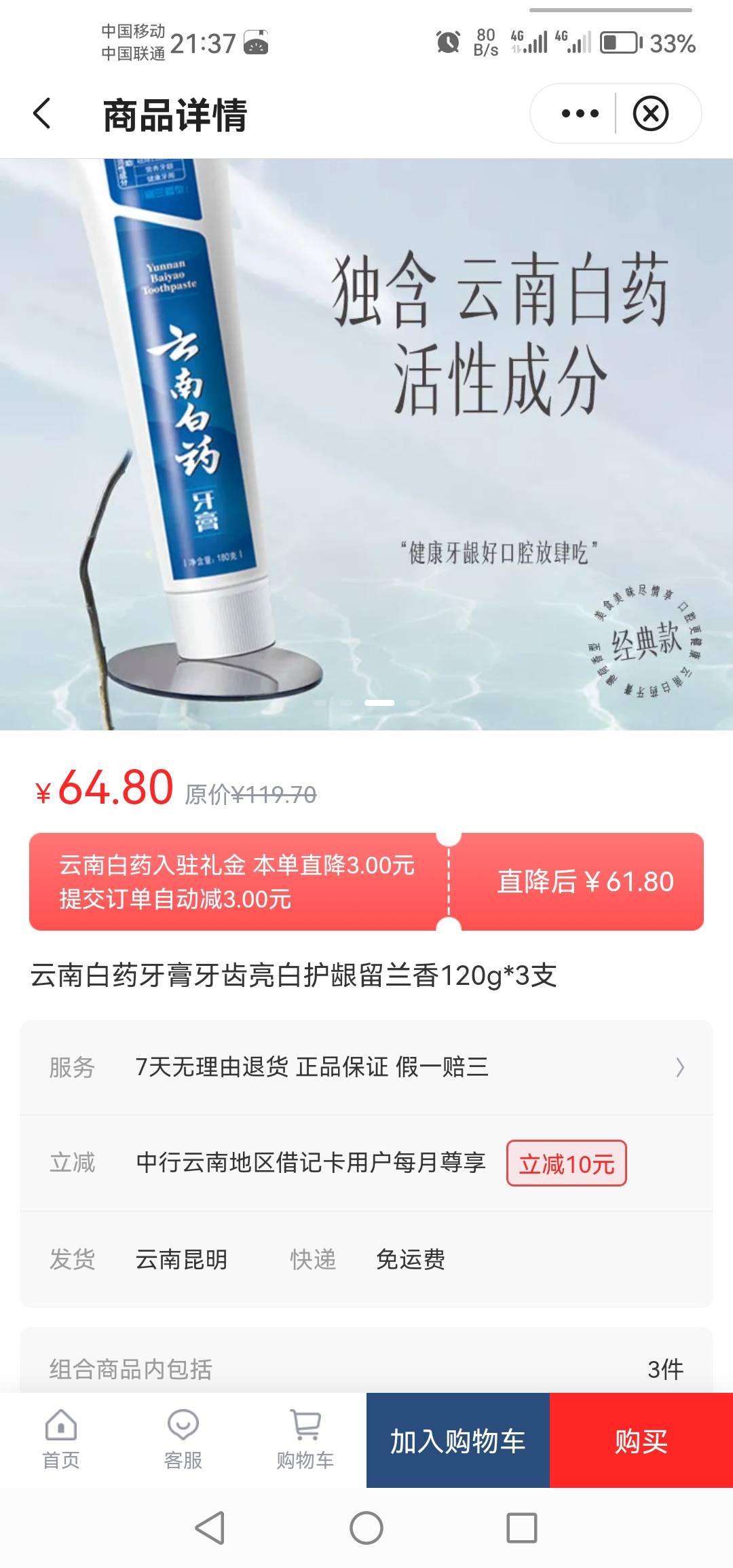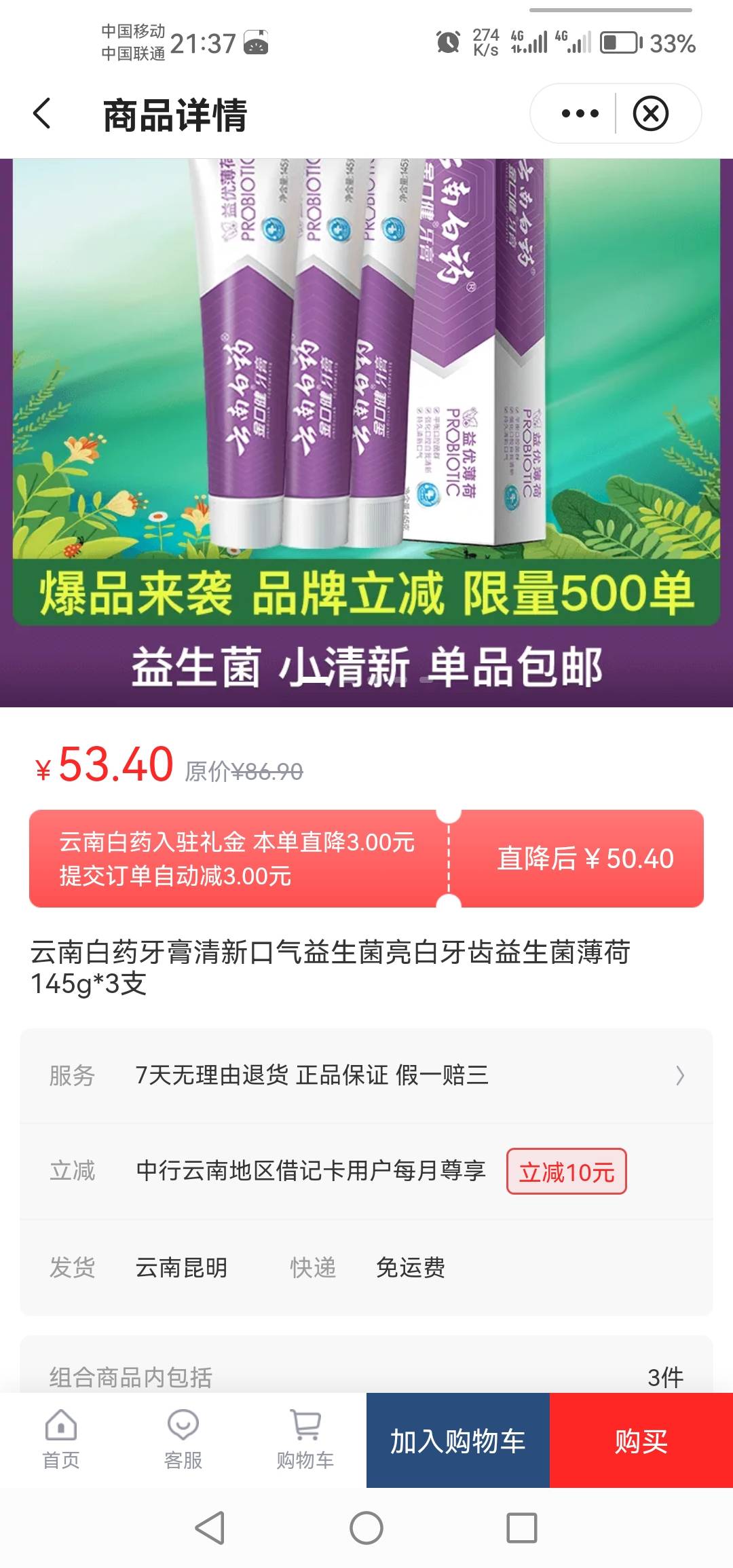 首发,中国银行云南,新上活动云南白药专区商城,有云南卡的立减10元,可以买云南白药牙膏,喷雾剂,食品等等,算下还是挺划算,买的牙膏喷雾剂那些可以自己用或者家人用或者买给朋友,有需要的可以去看看