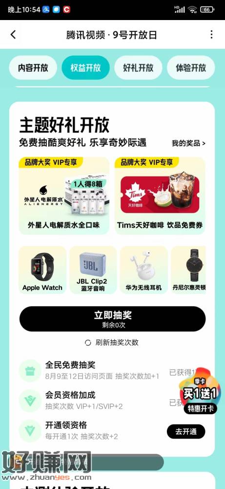 有会员的去腾讯视频首页抽奖,应该必中网易严选卡,挂玖玖4➕