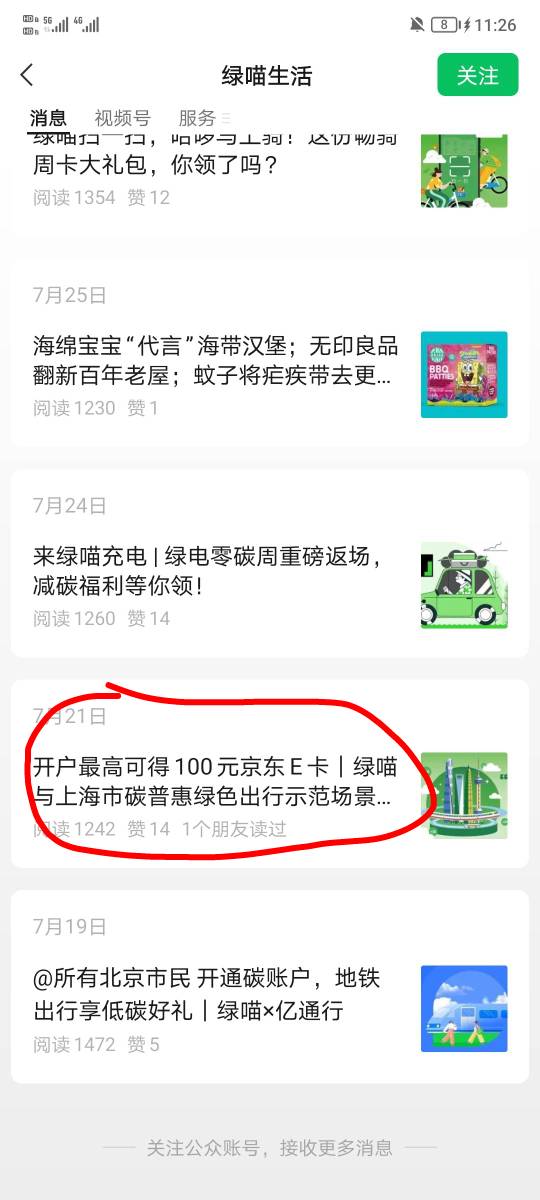 微信公众号绿喵生活7.21的推文抽e卡 跟着流程去操作就能抽奖,闲麻烦