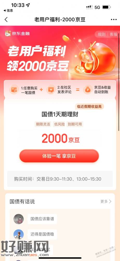 购一天期1000元国债逆回购,这个不会亏,两天后到2000京豆,可能受邀或者没交易过账号