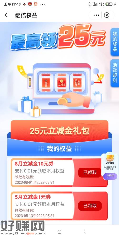 广东中行app-底部 生活 -粤有惠 点击进去 中间横幅第二个广告 25块钱立减金礼包 每个月1分钱换一份 另外还有做任务领中银豆 中银豆可以换立减金