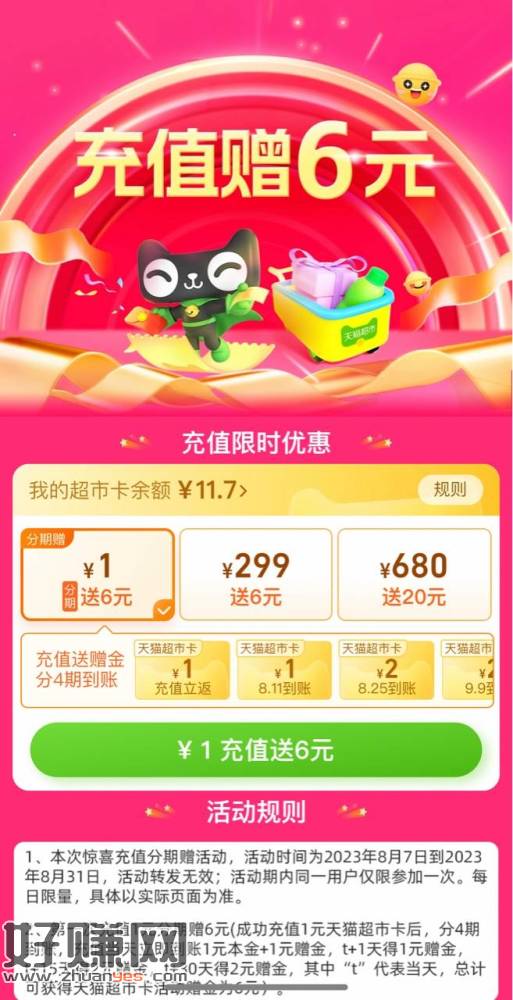 猫超冲1送6通用,手慢无,每天中午12点左右刷新名额