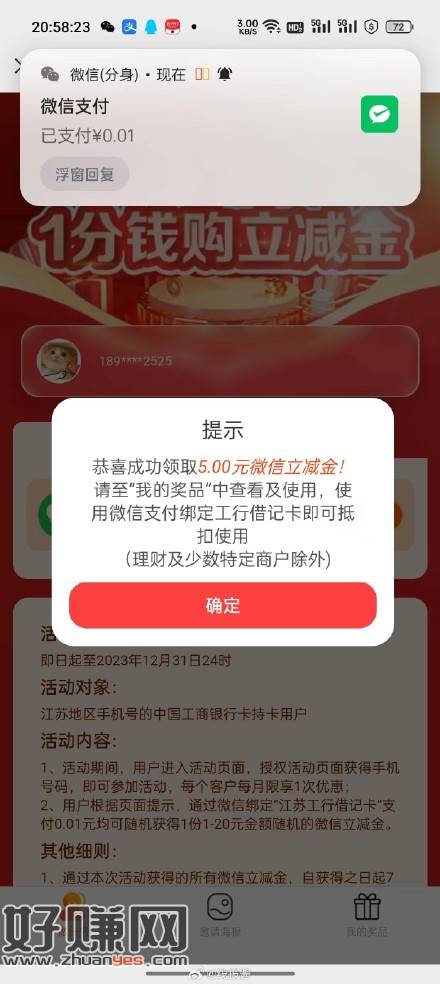 江苏工行,一般除苏州,储蓄卡支付1分钱抽5元立减金