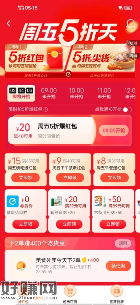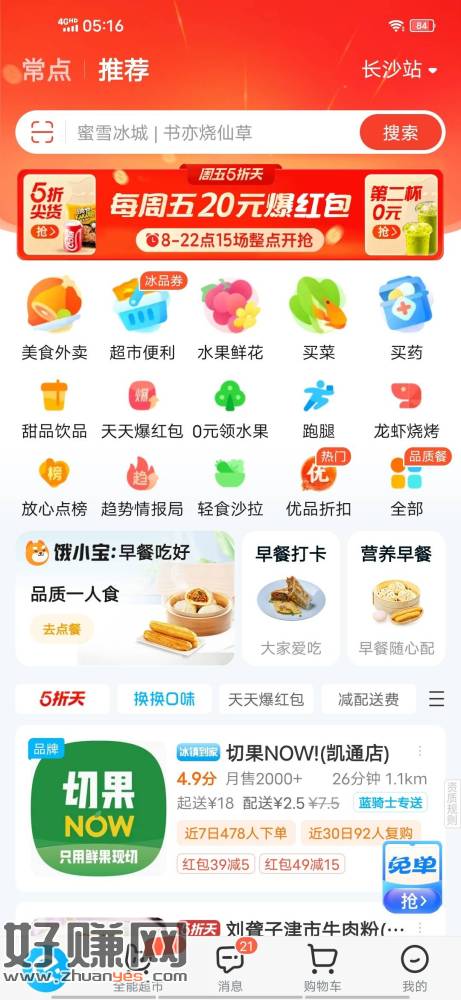 饿了么APP 地址在长沙 首页横幅 8点 40-20券