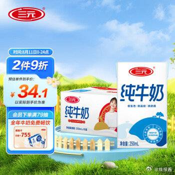 三元 方白纯牛奶 250ml*16礼盒装,plus2件44.4
