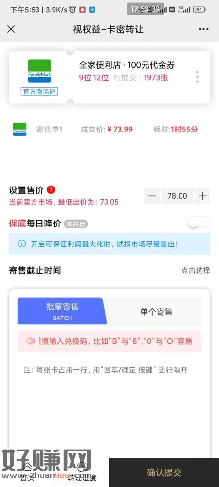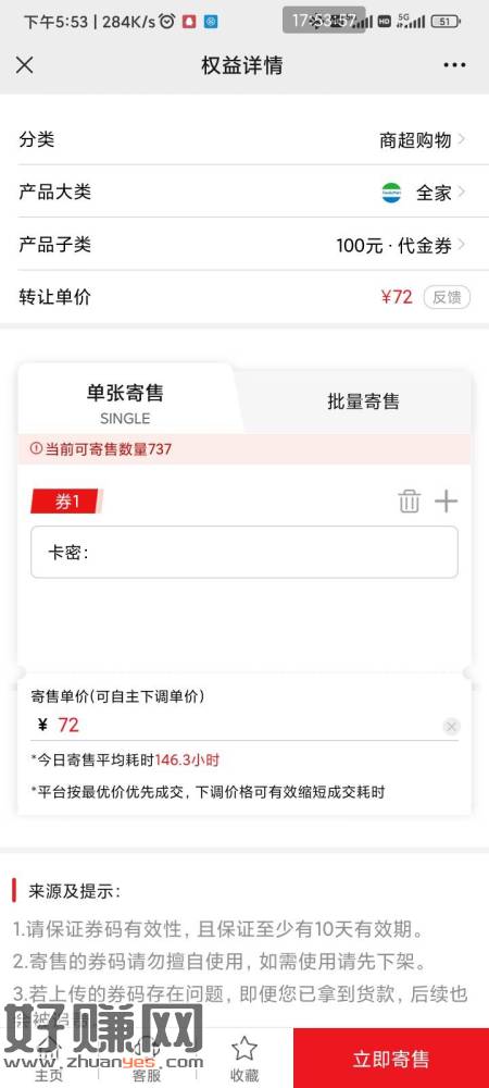 单号润5*2 多号多撸 抖音搜全家直播间 70买100代金券 没货就等会再买 不定时补货(过期自动退款,不用担心卖不出去亏本) 然后视权益回收78(价格虚高,实际还是72.73卖) 玖玖回收72(卖的很慢差不多一周)建议2边都挂上
