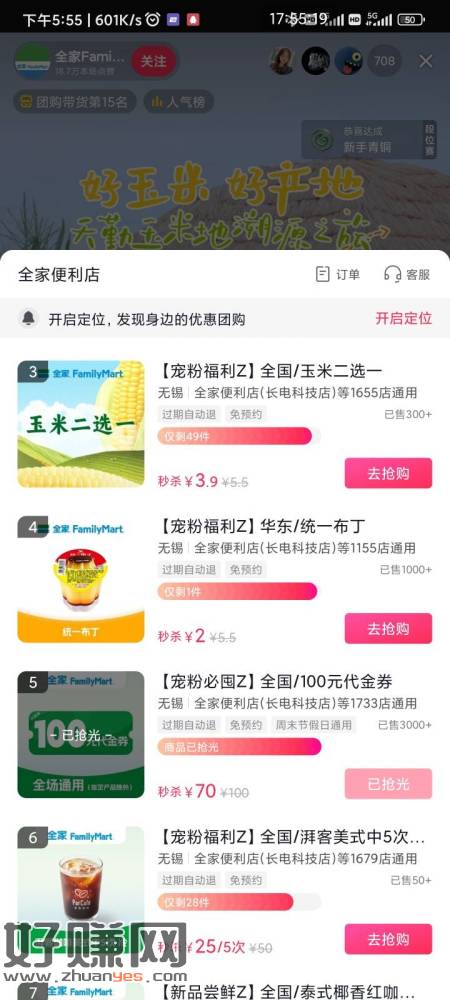 单号润5*2 多号多撸 抖音搜全家直播间 70买100代金券