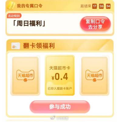 天猫超市-首页右下方悬浮图标“惊喜口令”-输入口令“周日福利”进入翻牌可领随机猫超卡