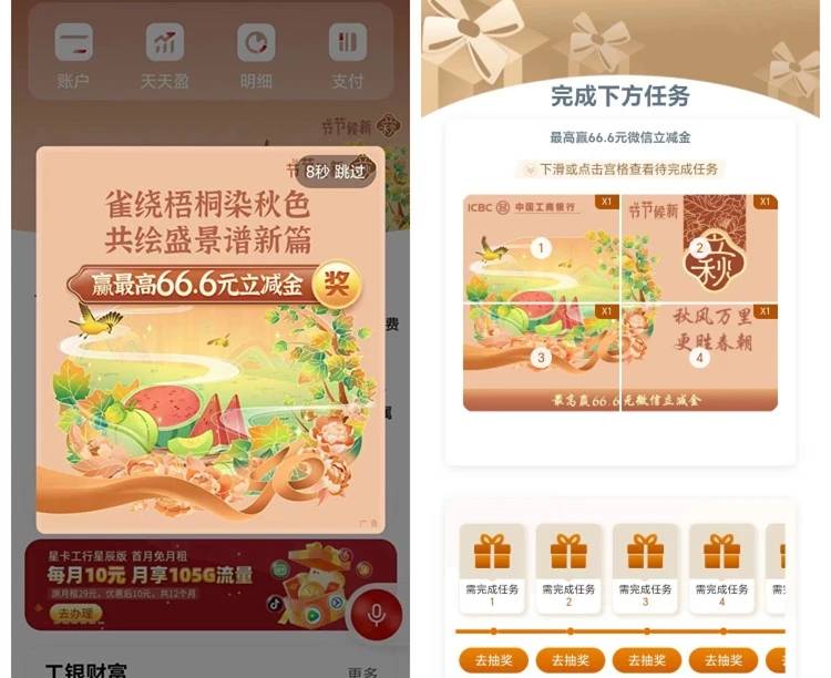 羊毛集中 工行抽最高66.6元立减金 工行APP-任务中心-享活动【秋风万里 更胜春朝】完成任务抽奖试试 最新版8月份的工行月月刷,储蓄卡、信用卡可参与月月刷 无损攻略:通过VX端每天从工行卡中转入到VX零钱通2笔5元就满足月月刷要求。