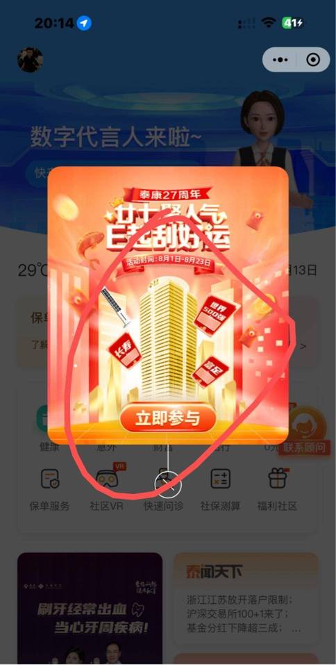 泰康入口在这 链接是有头的 小程序泰康e保 弹窗抽奖费机会