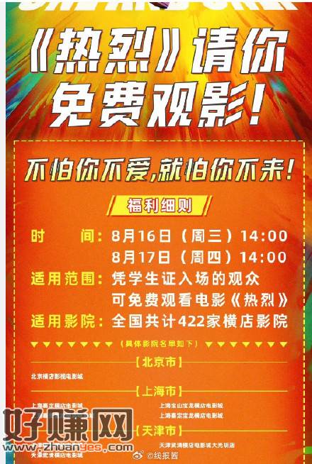8月16/17日,14:00全国横店免费观影《热烈》凭学生证即可观影