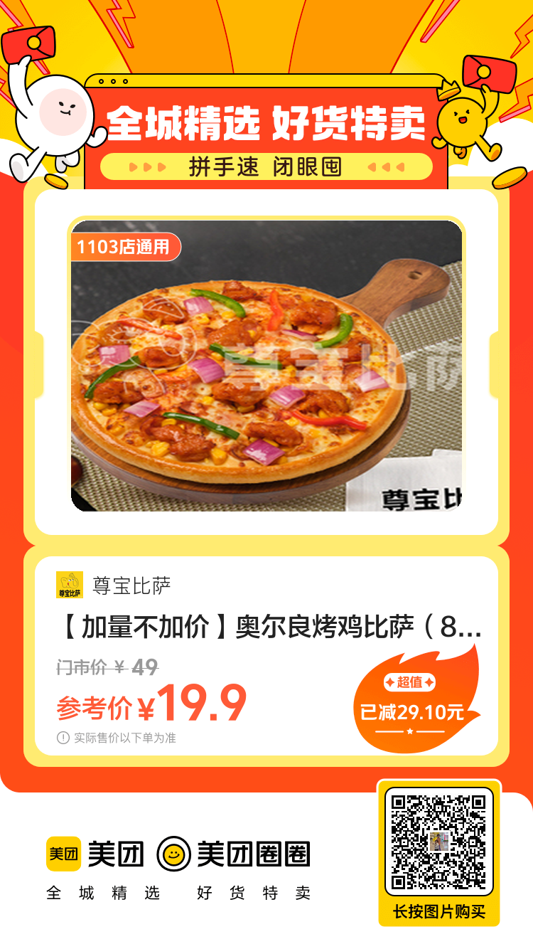 美团到店,19.9,尊宝比萨|[ 加量不加价 ]奥尔良烤鸡比