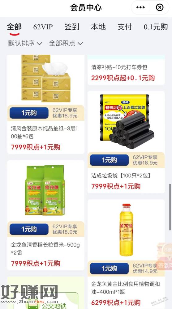 积点+1元换购抽纸6包,垃圾袋2包,金龙鱼香米500g,调和油400g,