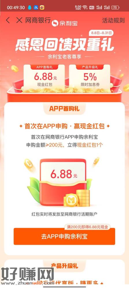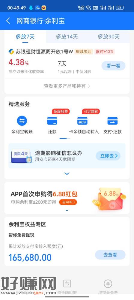 支付宝余利宝页面下面横幅有6.88的去网商银行APP充入一笔200秒到网商余额