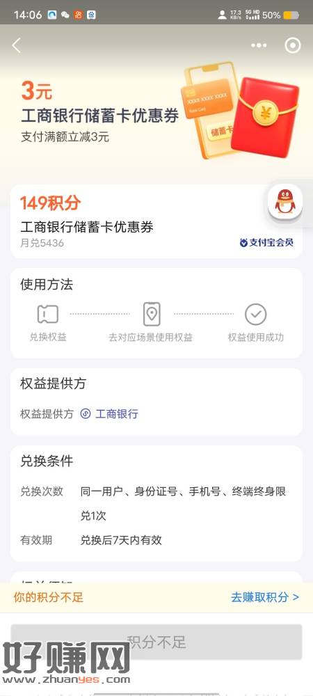 zfb-会员-搜工行,部分人149积分兑换3