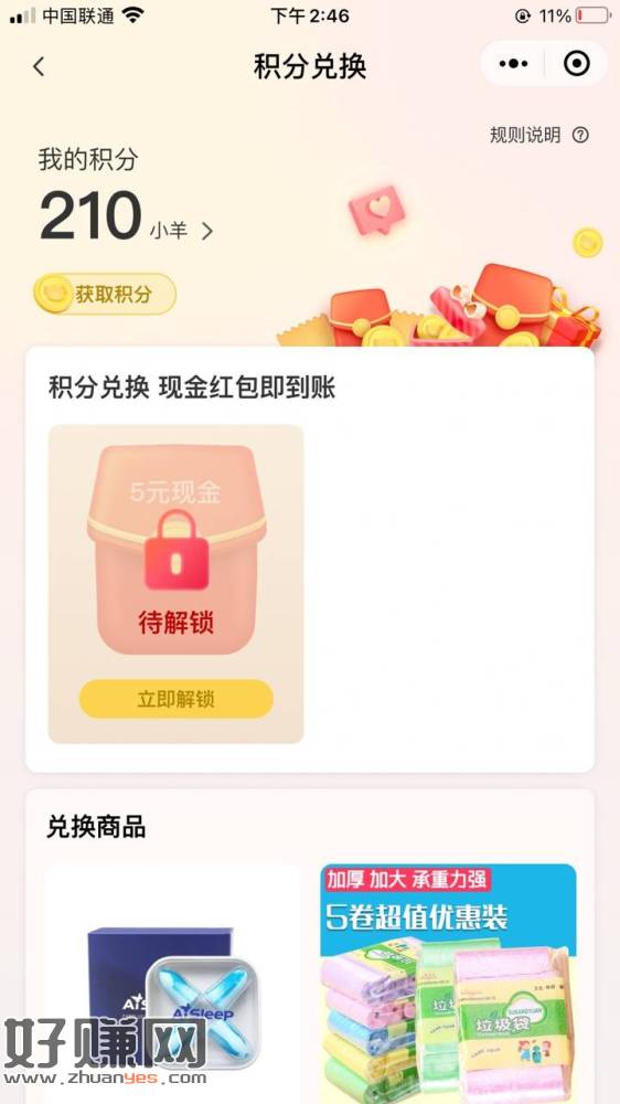 微信小程序: 小羊早晚安,我的积分里面拉自己3个小号早起打卡5天得5元,凌晨4点到中午12点才为早起打卡