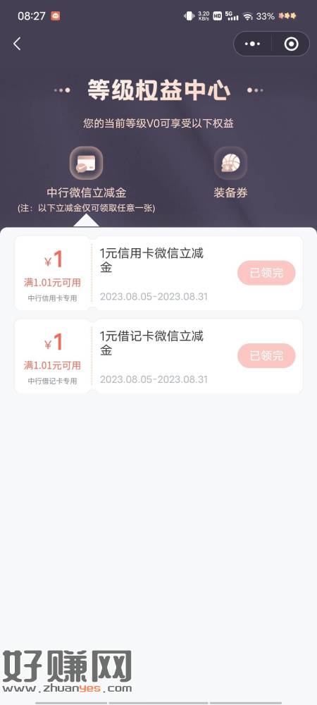 等级权益 储蓄卡 信用卡 5号拿1元立减金