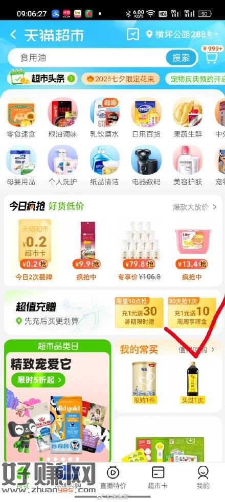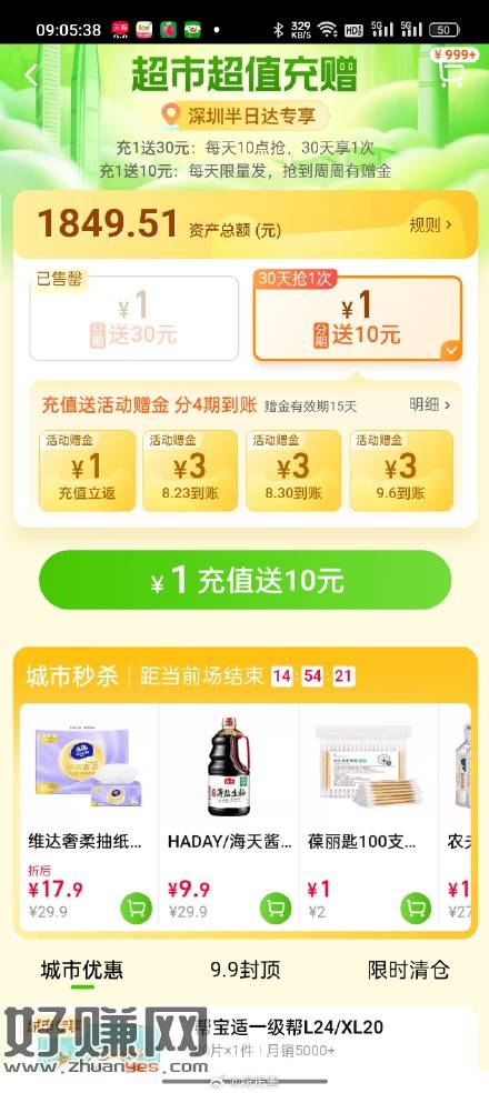 天猫APP,天猫超市改深圳或者广州地区,如图有1冲10,分期到账