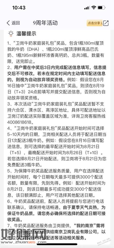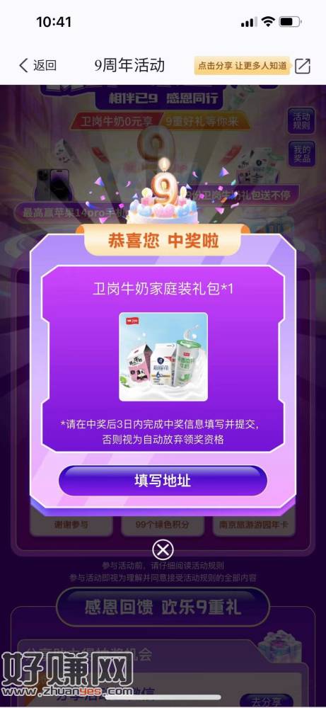 我的南京app,首页9周年活动,现在牛奶礼包洪水,抓紧时间抽。