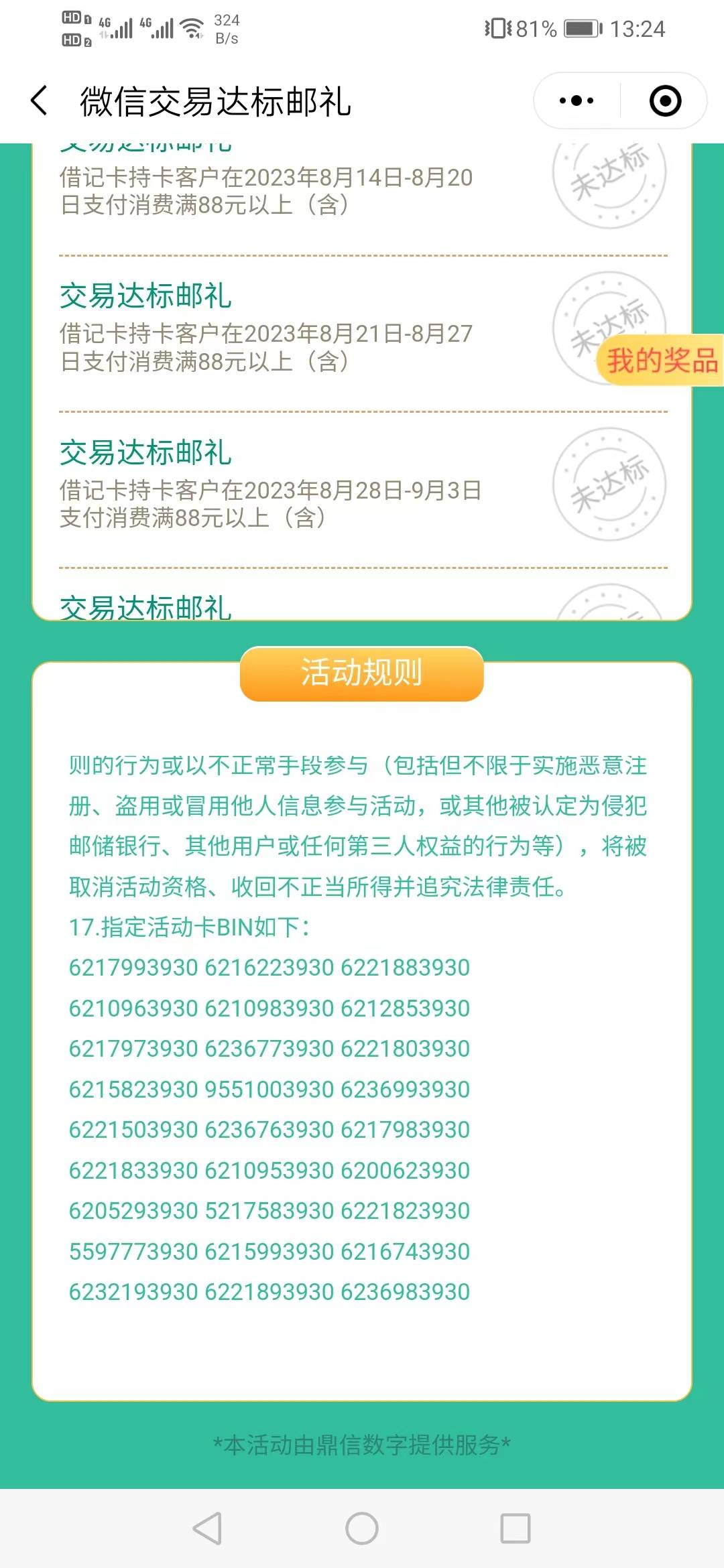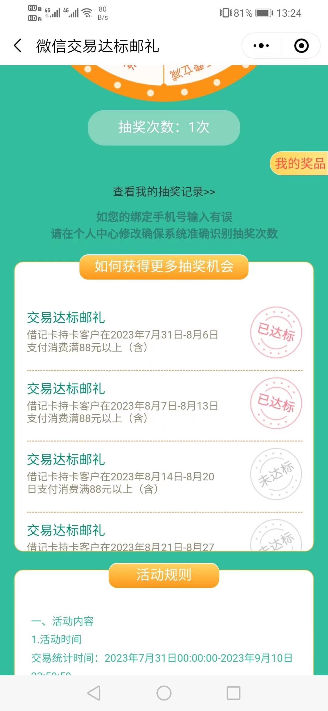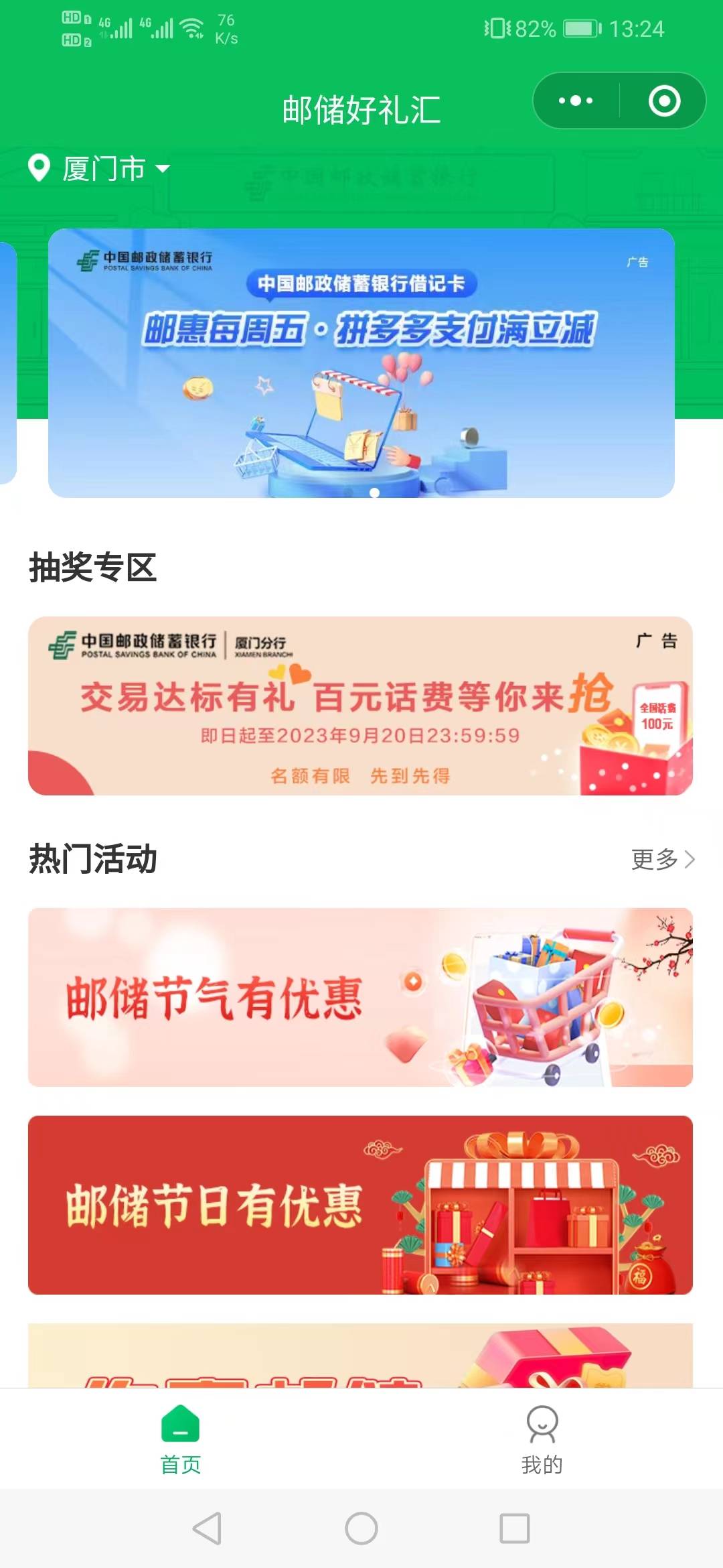 邮储厦门周消费交易达标礼可以抽了。入口小程序邮储好礼汇。手机YH飞一次