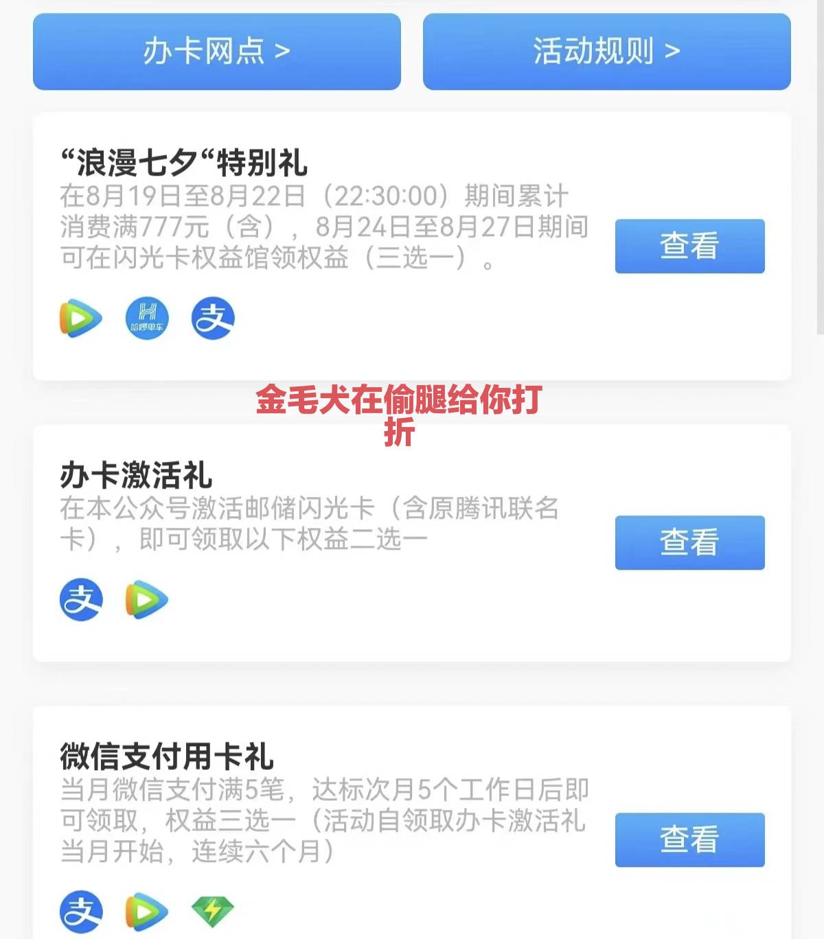 50大毛、邮储闪光卡! 1、开卡了绑定【邮储联名卡gzh→右下→闪光卡】参加活动 2、只需要在19号-22号,绑v用这卡零钱通存入777,就能搞到50大毛 消费777元:8月19日 —— 8月22日 (22:30:00) 期间累计消费满777元 领50大毛:8月24日 —— 8月27日期间可在闪光卡权益馆领权益 (三选一)。